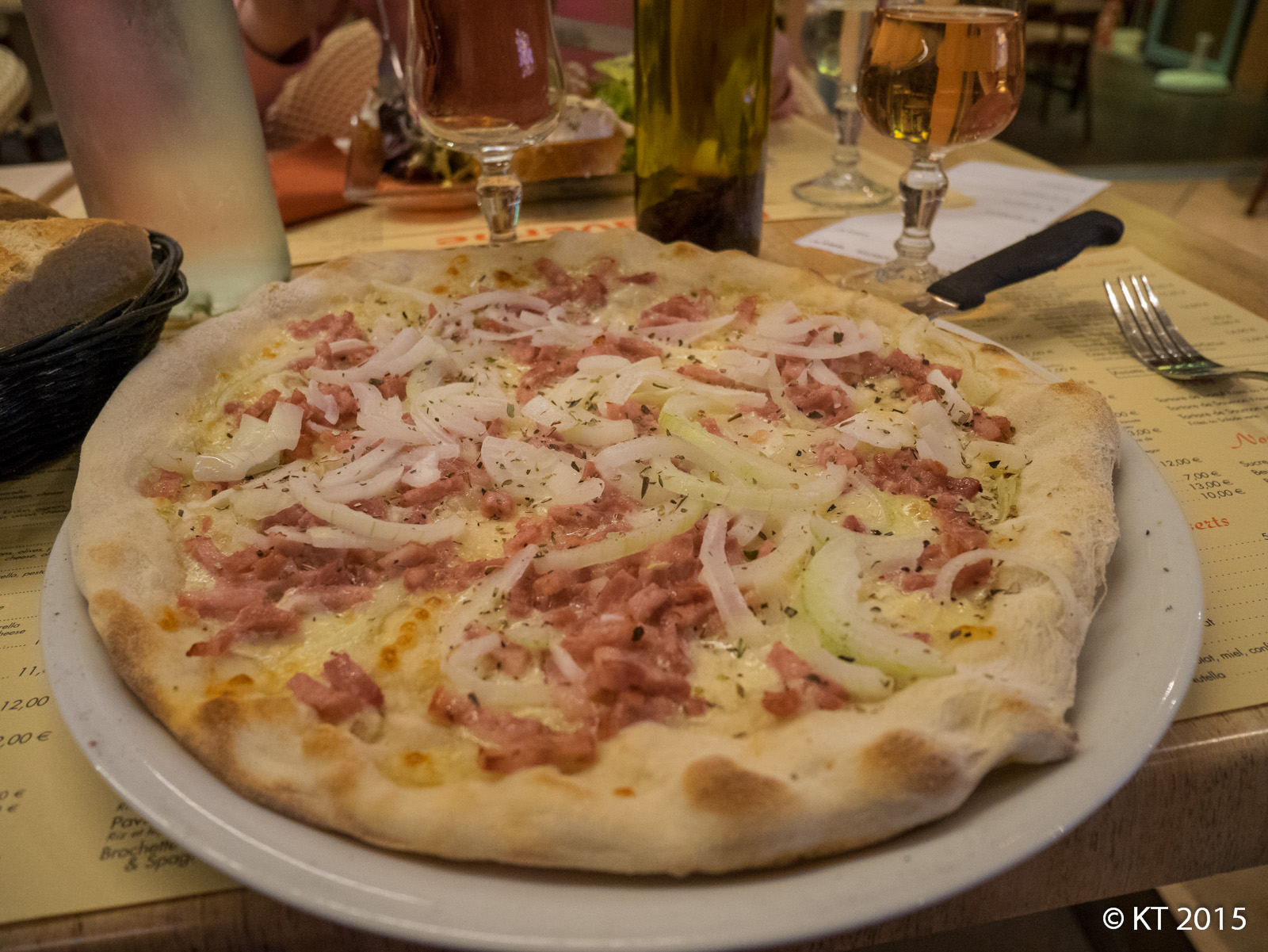 Hotellin ravintolan keittiö oli jo kiinni, mutta vierestä löytyi avoimia paikkoja mistä valita. Söimme entrecoten, flammküchenin ja vuohenjuustosalaatin roseen ja limsan kanssa. Ruokailun jälkeen menimme yöpuulle, eikä nukahtamista tarvinnut pitkän matkustuspäivän jälkeen odottaa ollenkaan.